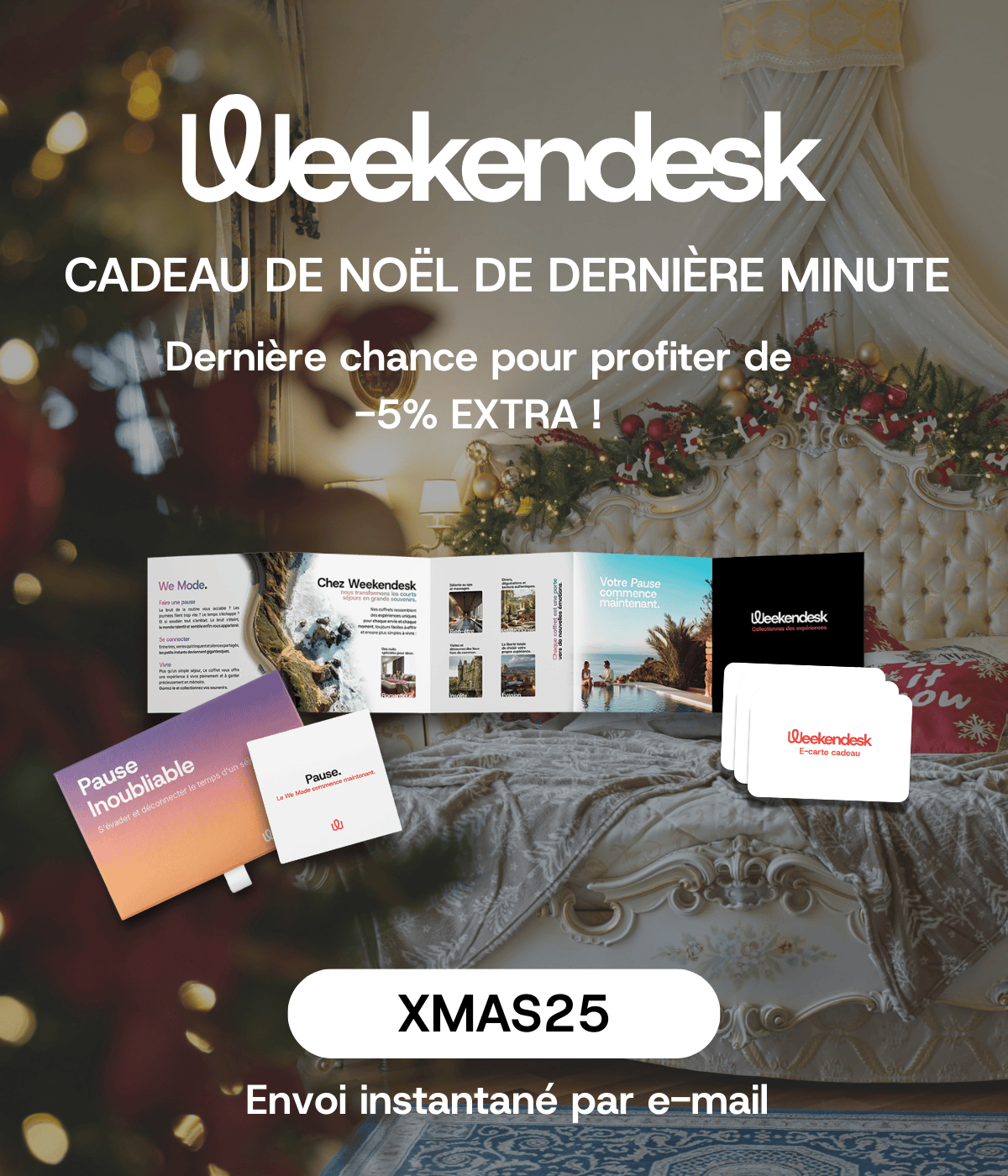 réduction EXTRA de -5 % avec le code XMAS25. Coffrets, activités ou séjours cadeaux : vous les recevrez instantanément par e-mail !